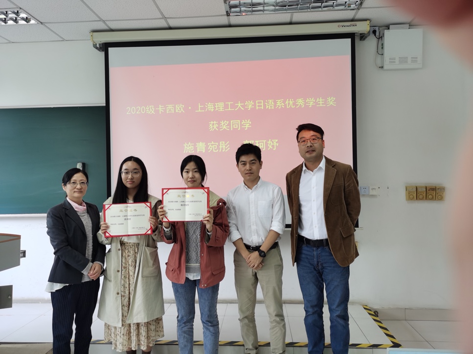 11月2日下午,卡西欧・上海理工大学日语系优秀学生奖”颁奖仪式在四教222教室举行。日语系2021级全体学生、日语系主任刘曼老师、外事秘书毛伟老师出席。2020级学生施青宛彤、郭珂妤两名同学获奖,作为奖励,两位同学分别获得2000元助学金和价值1000元的卡西欧手表。卡西欧上海公司电子教育部的庞立阳经理、日语系刘曼老师为获奖的两名同学颁奖并颁发荣誉证书。颁奖仪式后,庞经理向与会的大一新生同学介绍了一些优秀日本企业的发展现状,介绍了当前的就业形势并通过其个人经历介绍了作为日语系毕业生如何学好专业知识、走上社会,实现自己的人生目标。最后,庞经理介绍了卡西欧电子词典在日语学习过程中的作用和科学的使用方法,鼓励大家努力学习,奋发进取。此次颁奖活动不仅是对两名优秀学生代表阶段性专业学习成果的肯定,更有助于激励日语系大一新生同学把握时间、珍惜在外语学院四年的宝贵时间,努力提高自身专业能力。这次颁奖及讲座活动激发了新生的专业学习热情,将有助于我院日语系培养出更多高素质的外语人才。
