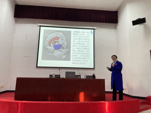 周教授认为随着神经科学和具身语义学的发展,人们需要重新认识身体、心智、脑和具身概念的关系。她以日常生活为例,以图片为辅,向同学们展示内感受的定义以及内稳态的后-中-前脑岛逐级整合模型,分析了身体-心智-情绪三者的关系。她提出内感受(Interoception)是构成认知、思维和行为动机的情感基础;而传统的具身认知研究主要聚焦于身体的外感受系统和运动系统,却忽视了内感受系统。根据汉英情绪词汇的对比研究,她发现与英语相比,汉语中情绪躯体化现象更普遍存在,反驳了西方学者关于中国人述情障碍的论点。基于汉英文化差异对于情感认知的影响以及中医的本体论思想,周教授提出一个新的多维情感模型。她认为身体的透明度与认知的颗粒度是两个彼此对立的维度,可以作为刻画不同文化间情感概念化差异的变量。新模型基于内感受神经科学和情绪的建构论等相关理论,厘清身、心、脑、语言和社会文化之间的多元互动关系。