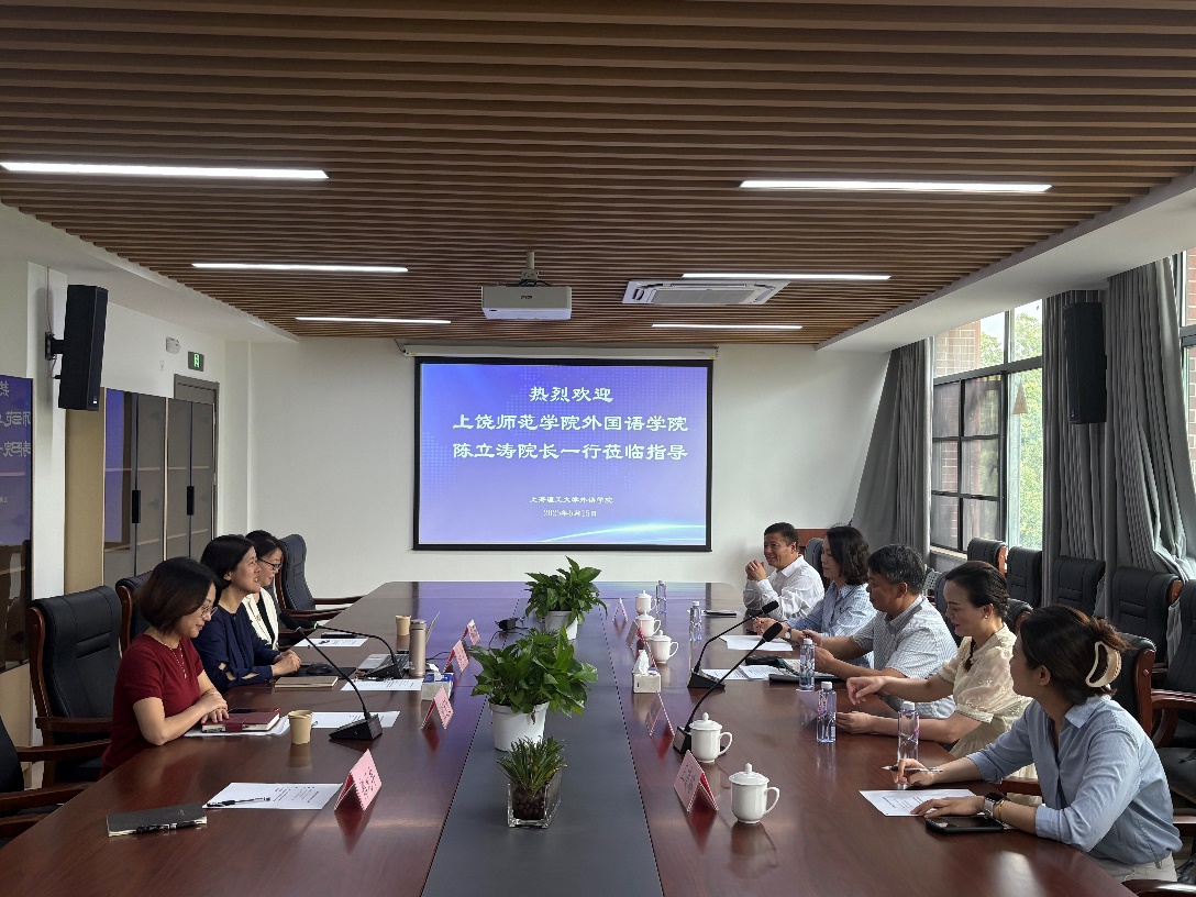 首先,刘芹代表学院对上饶师范学院外国语学院领导的来访表示热烈欢迎,并详细介绍了学院的历史沿革、师资成果、国际交流、校企合作和人才培养等情况。沈莲莲介绍了学院学生就业工作、创新力培养和创新创业项目情况。黄芳对国际合作办学和课程设置进行了介绍。