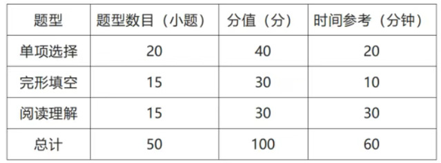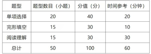 满分为100分,时间为60分钟,共3种题型50道题,全部为客观题。参赛选手不得使用任何纸质词典、电子词典和工具书。