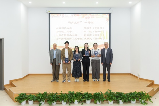 接着,第四届“沪江杯”科技翻译大赛颁奖典礼拉开帷幕。本次大赛设立英、日、德与中文互译,吸引了来自242家院校及企事业单位、共计2192人次报名参赛。大赛评审委员会组织35位专家共进行初评、复评和总评三轮匿名评审,共评选出365名获奖者。其中,英语组获奖人数为263人,日语组获奖人数为61人,德语组获奖人数为41人;一等奖10人,二等奖20人,三等奖65人和优秀奖270人。上海外国语大学高级翻译学院荣誉院长柴明熲教授,上海海事大学外国语学院原院长、上海市科技翻译学会原会长左飚教授、上海外国语大学高级翻译学院院长张爱玲教授、上海理工大学外语学院院长刘芹教授、上海师范大学外国语学院副院长宋梅砚教授、上海应用技术大学外国语学院副院长叶湘教授,上海外国语大学贤达经济人文学院外国语学院副院长郑媛媛教授为获奖学生代表颁奖。中译英一等奖获得者上海师范大学陈家杏、英译中一等奖获得者上海理工大学朱钰、德译中一等奖获得者上海应用技术大学赵力霏、日译中一等奖获得者上海外国语大学贤达经济人文学院凤雅慧分别发表了获奖感言。该环节由我院25级研究生李奕慕、于青鹭、杨婧和王壮有主持。