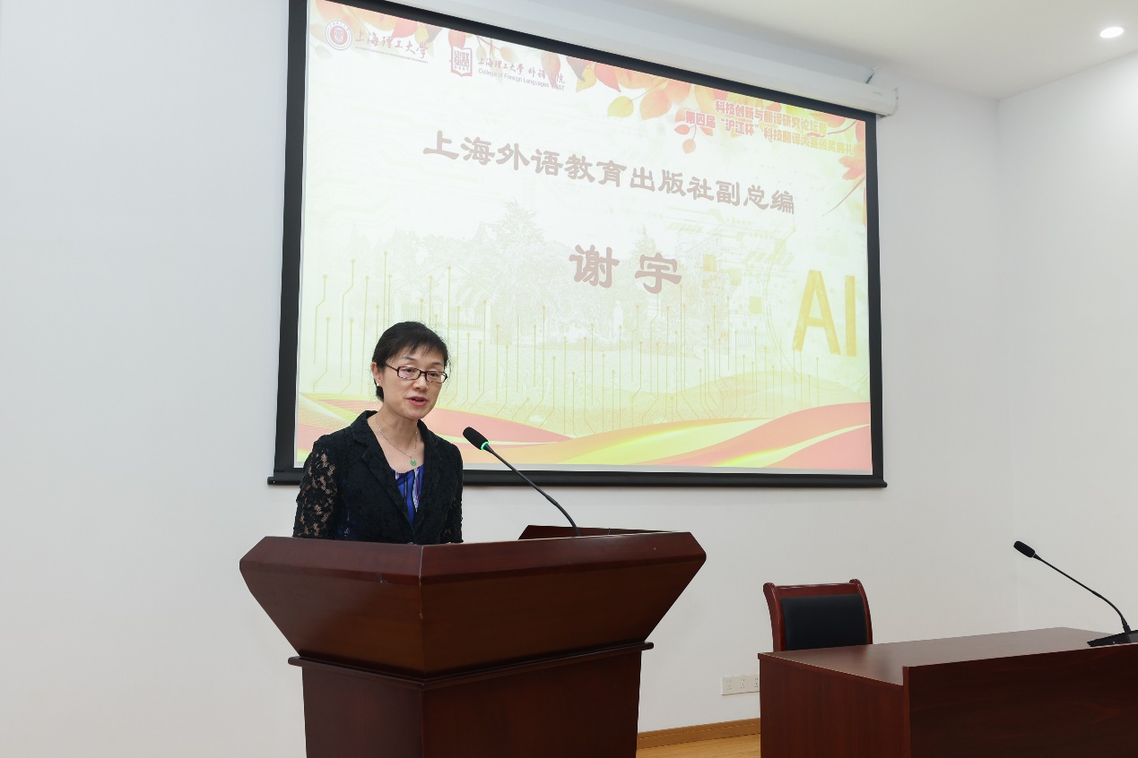 论坛开幕式由外语学院院长刘芹主持,副校长蔡永莲致欢迎辞。蔡校长指出,学校连续举办四届‘沪江杯”全国科技翻译比赛,为全莘莘学子和翻译爱好者提供一个展示才华、交流互鉴的平台。希望外语学院以此为契机,把握翻译学科发展的新动向,以赛促学,培养高水平科技翻译人才。她鼓励同学们保持对语言的热爱、对科技的追求、对未知的探索,不断提升自身综合素养,未来在更广阔的国际舞台上,传播中国科技前沿成果,造福人类文明。接着,上海外语教育出版社副总编谢宇在致辞中强调出版社将积极整合多方资源,深化产学研协同创新,全方位助力科技翻译事业的高质量可持续发展。