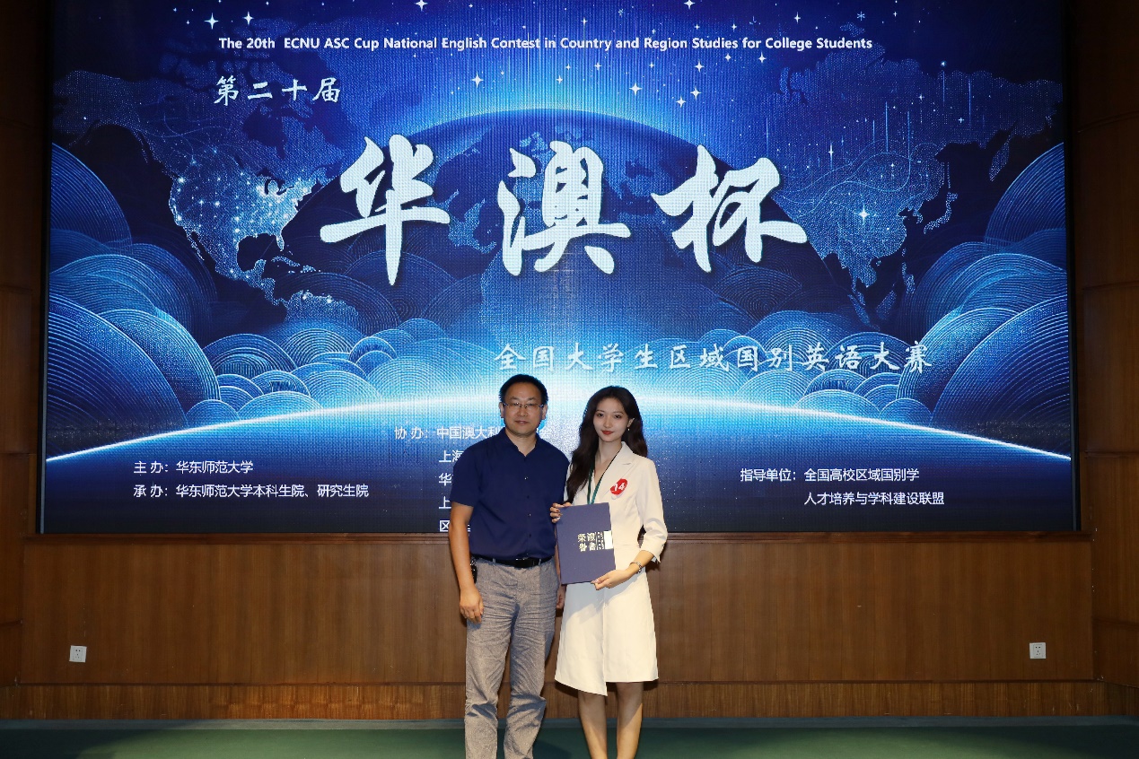 2025年10月18日,由华东师范大学主办的第二十届“华澳杯”全国大学生区域国别英语大赛在华东师范大学中北校区逸夫楼报告厅盛大举办。来自全国多所知名高校的优秀学子齐聚一堂,展开了一场关于区域国别研究与英语表达的高水平竞技。我校澳研中心选送的外语学院22级勇一涵同学在众多强手中脱颖而出,荣获全国一等奖!