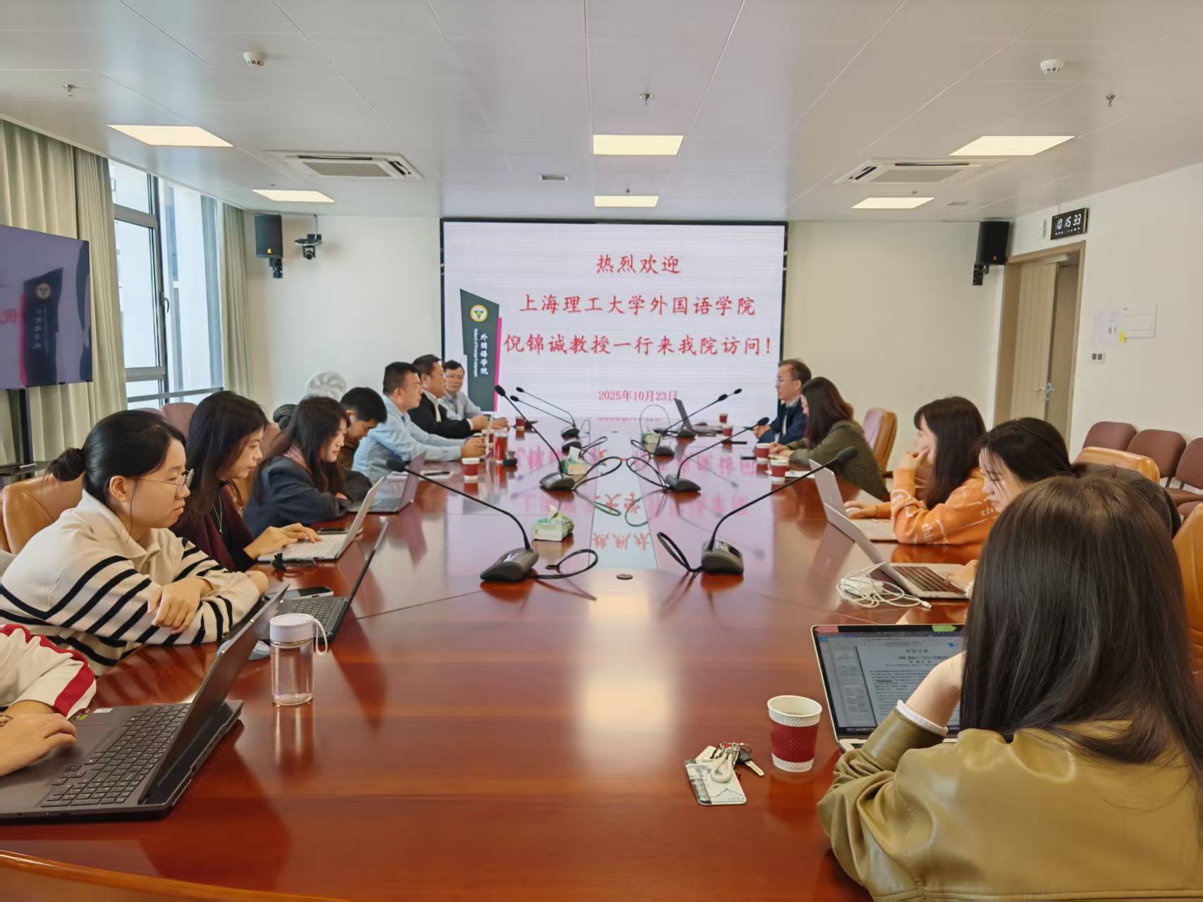 在随后的专题研讨环节,双方教师围绕语言学领域的前沿议题展开深入而富有建设性的讨论,内容涵盖科研创新路径探索、交叉学科平台建设、信息技术与语言研究的深度融合等关键方向。讨论过程中,与会专家结合各自研究专长,分享了在认知语言学、应用语言学及语言智能等新兴交叉领域的研究经验与前瞻思考,并就学科融合过程中面临的理论挑战与方法论创新进行了多维度探讨。