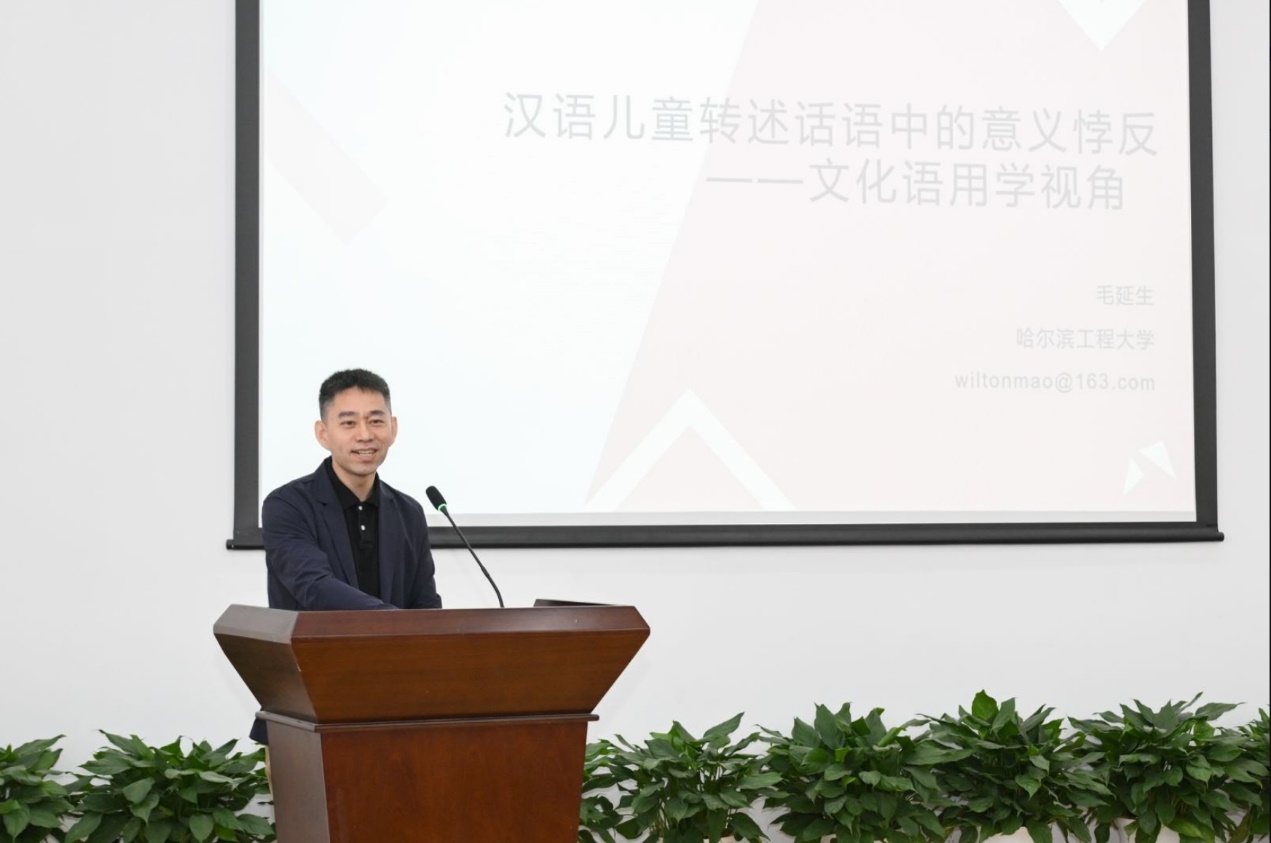 4月20日上午,广东外语外贸大学的冯光武教授在“文化知识与语用推理”的发言中,提出了以听话人为中心、文化知识为基础的语用推理模式,为语用学研究提供了新的视角。黑龙江大学的黄萍教授以“文化语用学视阈下老年语言生活多维阐释”为题,从文化语用学视角审视老年语言生活,为应对人口老龄化带来的语蚀和语损问题提供了文化语用学应对路径。哈尔滨工程大学的毛延生教授在“汉语儿童转述话语中的意义悖反——文化语用学视角”的发言中,探讨了汉语儿童转述话语中的意义悖反现象,不仅为儿童语言发展研究提供了新的思路,而且为特殊儿童群体的临床诊断与辅助康复提供语用学依据。上海理工大学的韩戈玲教授以“汉语儿童言语行为与语用发展研究”为题,通过个案跟踪和实验研究,揭示了汉语儿童语用能力的发展规律及家庭社会文化影响因素,为数智时代儿童语言教育和交际能力培养提供了参考。九位专家的精彩主旨发言为参会者提供了丰富的学术思想和研究视角。