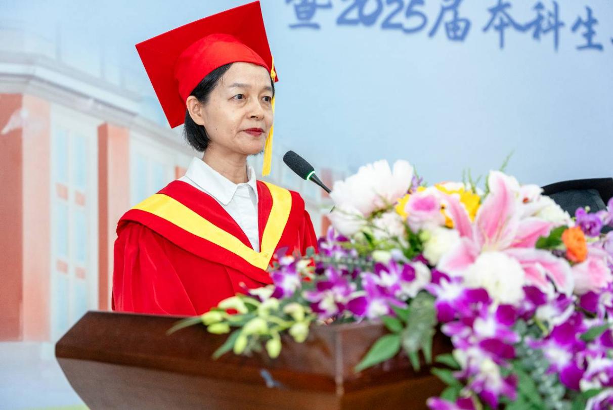 蔡永莲副校长致辞,她回顾了英语(中美合作)专业的发展历程,向为合作项目付出辛勤努力的中美双方老师表示衷心的感谢,向各位毕业生同学表示由衷的祝贺,以今年上海高考作文题"专·转·传"为启,愿青年学子以"专"筑基、以"跨"破界、以"传"致远,深耕专业沃土厚植家国情怀,跨越文化藩篱联通世界脉搏,最终成长为有根有魂的文明传播者。希望全体毕业生牢记“信义勤爱、思学志远”校训,努力工作,展现中国青年的智慧与担当,向世界传递可信、可敬、可爱的中国形象。