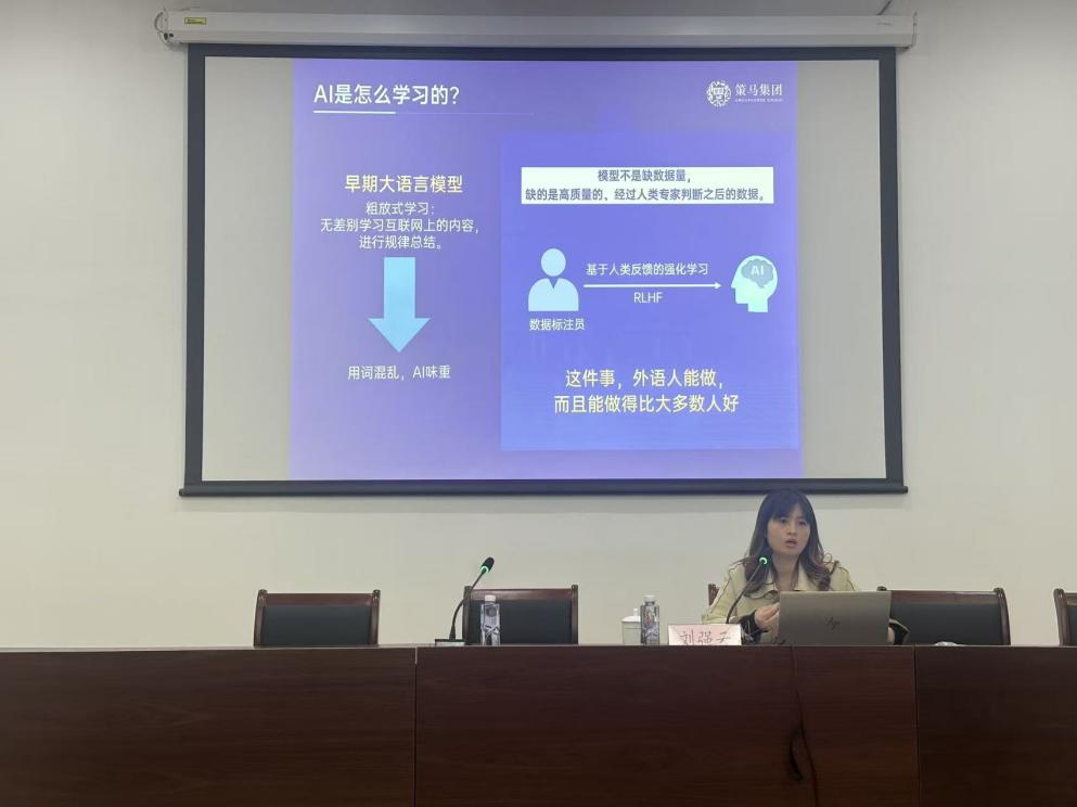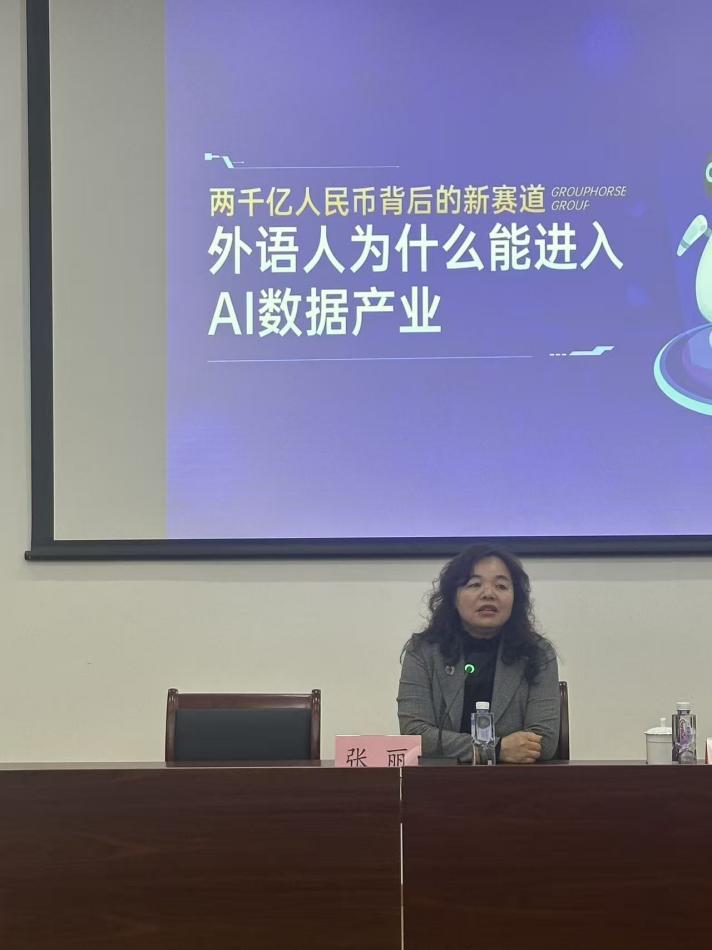 随后,策马集团董事长助理刘强云以时代发展为背景,围绕“人工智能时代外语人才的职业新通路”展开深入浅出的讲解。她结合当前技术趋势,解析了数据标注作为AI基础设施的核心价值,并详细论述了外语学习者在高阶数据标注,尤其是专家标注、跨文化判断以及法律金融等复杂任务中的独特优势。她指出,当前“十五五”规划已把高质量数据集的构建列为重要方向,作为联合国官方指定服务商,同时也是“联合国大学全球人工智能网络”的合作伙伴,策马集团目前正全面拓展高端数据标注业务,亟需具备较强语言功底与专业判别能力的外语类专业人才。她欢迎同学们加入人工智能数据产业队伍,积极响应人工智能时代的产业变革,将外语专业能力迁移至人工智能数据工程领域,成为衔接人机世界的桥梁。