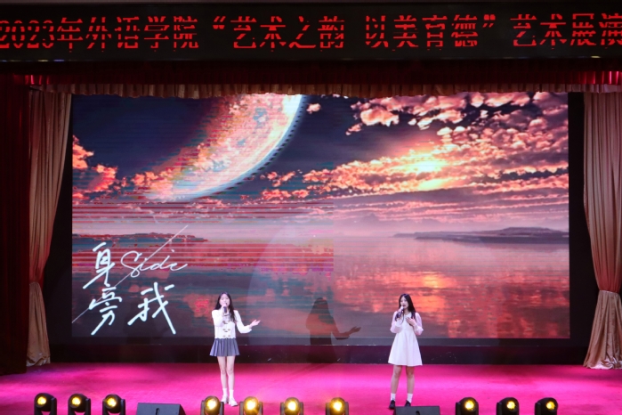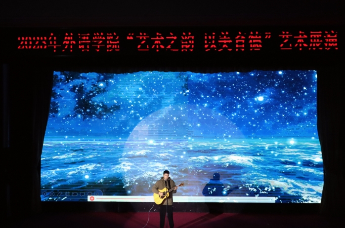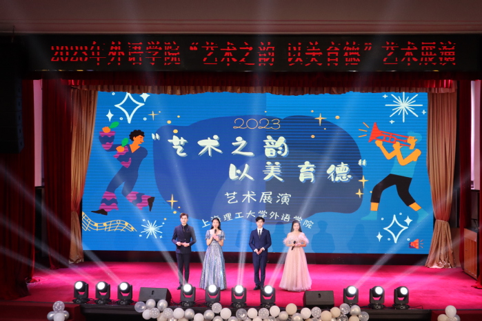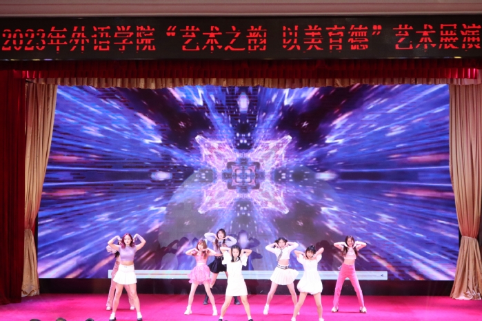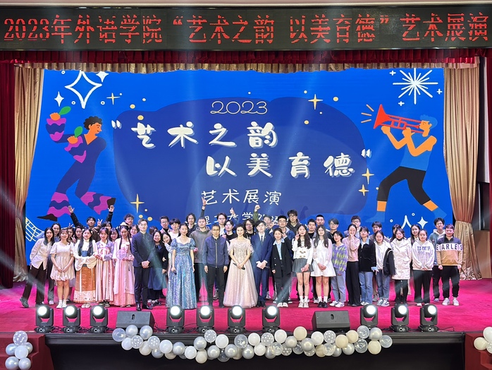 高校美育工作是人才培养体系的重要组成部分,为了丰富校园生活,提升我校学生艺术素养,促进学生德智体美劳全面发展,4月7日晚,由外语学院主办的“艺术之韵,以美育德”艺术展演晚会在大礼堂顺利举行。外语学院党委书记曲德强、副书记金小东、副院长韩戈玲出席本次晚会,全校五百余师生观看演出。