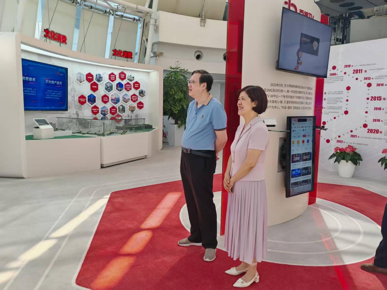 在黄凯校友的陪同下,外语学院一行首先参观了东方明珠新媒体股份有限公司的企业展示区。参观过程中,黄凯详细介绍了公司的发展历程、核心业务布局以及在媒体融合与数字化转型方面的战略实践与创新成果。