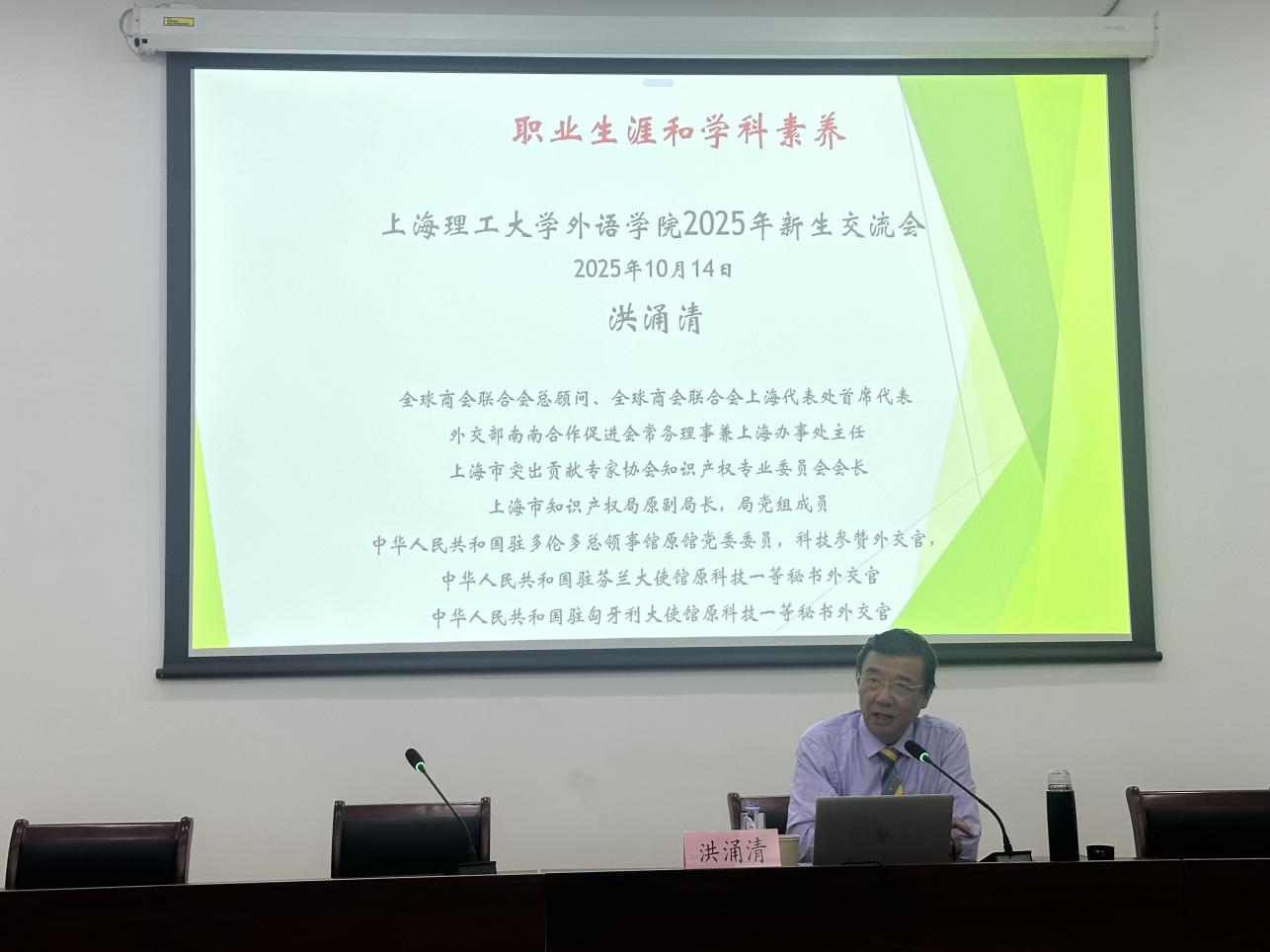 10月14日下午,外语学院在报告厅举办职业生涯教育专题讲座,特邀外语学院校友理事会会长、上海市知识产权局原副局长洪涌清先生担任主讲嘉宾。本次讲座也是外语学院针对大一新生开设的《职业生涯与学科素养》必修课程的其中一讲,讲座由外语学院学业发展中心指导老师苏予燕主持,全体大一新生、高年级本科生及研究生代表参加。